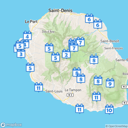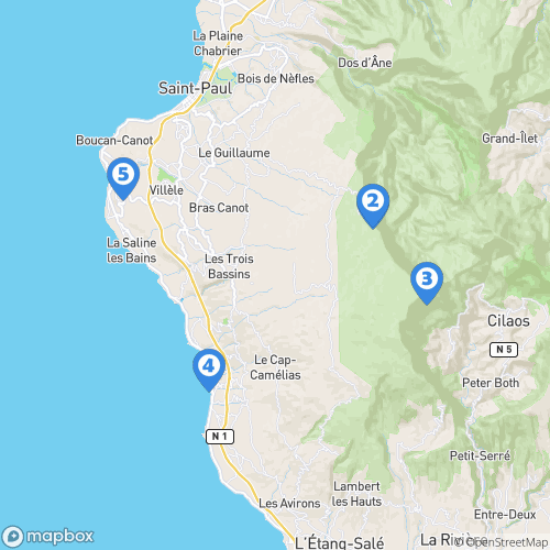 1. Belvédère du Maïdo 2. Piton Maïdo 3. Grand Bénare 4. Plage de Saint-Leu 5. Chemin Carosse (Saint-Gilles Les Bains)