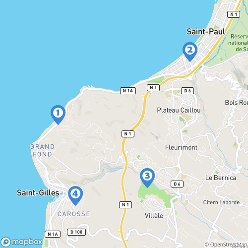 1. Plage de Boucan Canot 2. Marché forain de Saint-Paul 3. Bassin Bleu 4. Chemin Carosse (Saint-Gilles Les Bains)