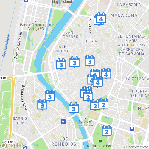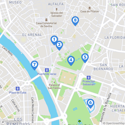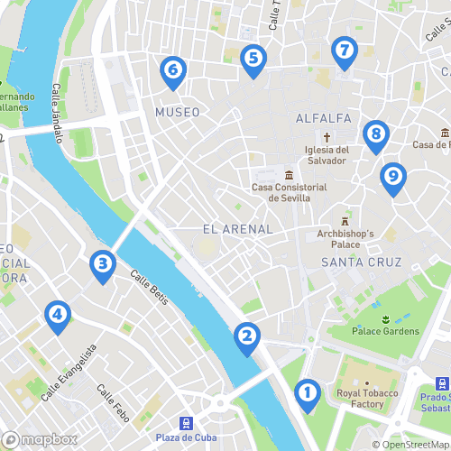 1. Palais de San Telmo 2. Tour de l'or Séville 3. Quartier de triana 4. eglise San Jacinto 5. Corte Ingles 6. Musée des Beaux-Arts de Séville 7. Metropol Parasol 8. La bodega de la alfalfa 9. Hotel Petit Palace Santa Cruz