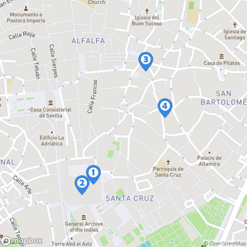 1. Minaret de la Giralda 2. Cathédrale Notre-Dame du Siège de Séville 3. La bodega de la alfalfa 4. Hotel Petit Palace Santa Cruz