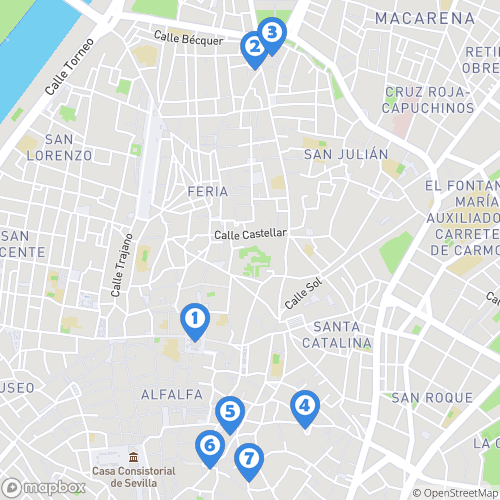 1. Metropol Parasol 2. basilic de la Chancia - Macarena 3. remparts almohades 4. Maison de Pilates 5. La bodega de la alfalfa 6. Musee du Flamenco 7. Hotel Petit Palace Santa Cruz
