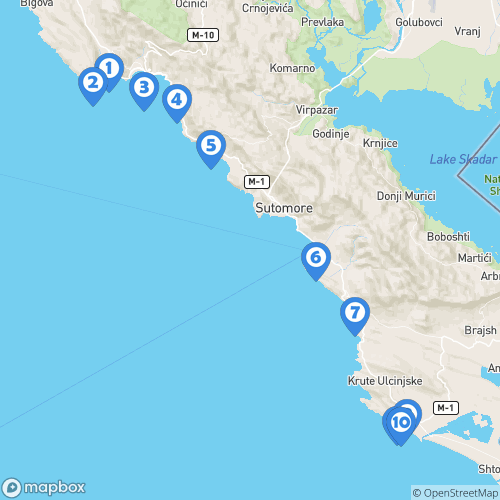 1. Plage de Jaz 2. Plage de Ploce 3. Île de Sveti Nikola 4. Sveti Stefan 5. Ville Petrovac 6. Ville de Bar 7. veliki pijesak 8. Ville de Ulcinj 9. Château d'Ulcinj 10. Mala Plaža