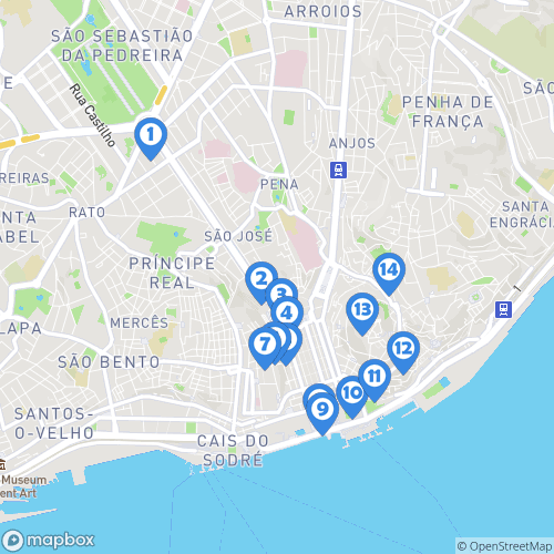 1. Place Marquis de Pombal 2. Place Restauradores 3. Théâtre National Dona Maria II 4. Place Don Pedro IV (Rossio) 5. Ascenseur de Santa Justa 6. Couvent Carmo 7. Place Largo Carmo 8. Arc de triomphe de la rue Augusta 9. Place do Comércio 10. Église Nossa Senhora da Conceição Velha 11. Cathédrale Santa Maria Maior de Lisbonne 12. Belvédère de Santa Luzia 13. Castelo de São Jorge 14. Miradouro Sophia de Mello Breyner Andresen