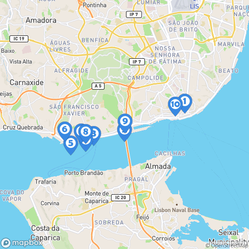1. Place Figueira 2. Pont du 25 Avril 3. Place Afonso de Albuquerque 4. Monument des découvertes 5. Tour de Belém 6. Quartier de Belém 7. Monastère des Hiéronymites 8. Église de Santa Maria de Belém 9. Quartier LX Factory 10. Bairro Alto