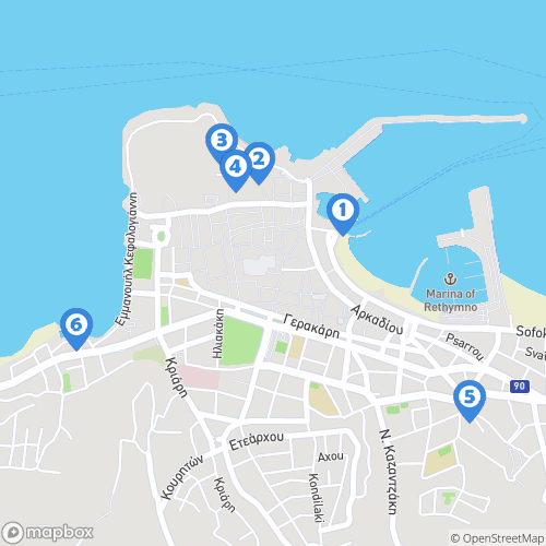 1. Port vénitien de Rethymnon 2. Forteresse de Réthymnon 3. Citadelle vénitienne de Rethymnon 4. Musée archéologique de Rethymnon 5. Vieille ville de Rethymnon 6. Réthymnon