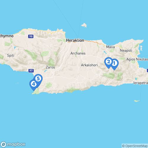 1. Plateau de Lassithi 2. Grotte de Psychro 3. Village de Pitsidia 4. Plage de Matala 5. Village de Kamilari