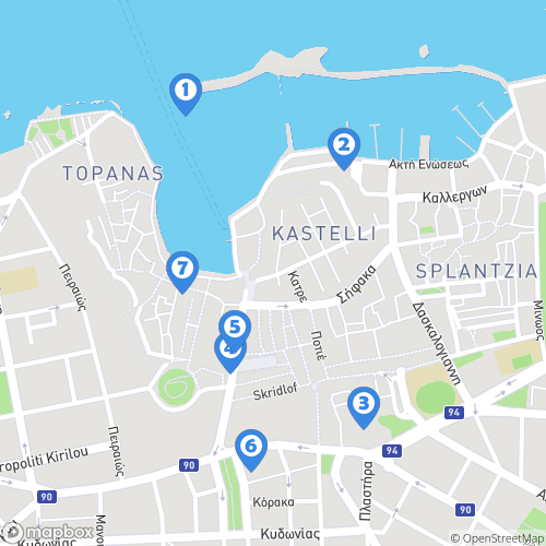 1. Phare de La Canée 2. Vieux port vénitien 3. Marché de Chania 4. Musée du Folklore Chania 5. Musée archéologique de la Canée 6. Ville de la Canée 7. La Canée