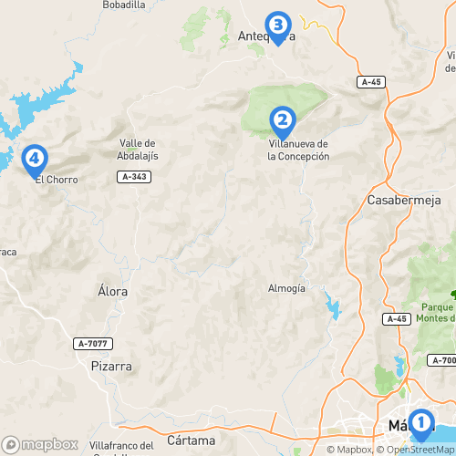 1. Málaga 2. El Torcal 3. Dolmen de Viera 4. Caminito del Rey