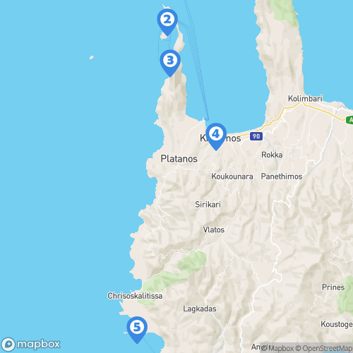 1. Ville de Kissamos 2. Presqu'île de Gramvousa 3. Plage de Balos 4. Ville de Kissamos 5. Plage d'Elafonissi