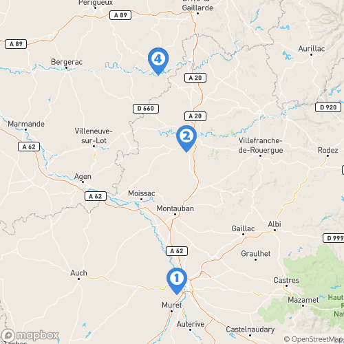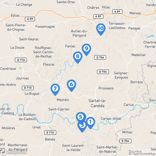 1. La Roque-Gageac 2. Château de Castelnaud-la-Chapelle 3. Castelnaud la Chapelle 4. Château de Beynac-et-Cazenac 5. Beynac 6. Château de Commarque 7. Les Eyzies-de-Tayac-Sireuil 8. Château de Losse 9. Grotte de Lascaux