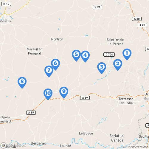 1. Ségur le Château 2. Savignac Lédrier 3. St Medar d'Excideuil 4. Thivier 5. St Jean de Côle 6. Brantôme-en-Périgord 7. Bourdeille 8. Riberac 9. Cathédrale de Périgueux