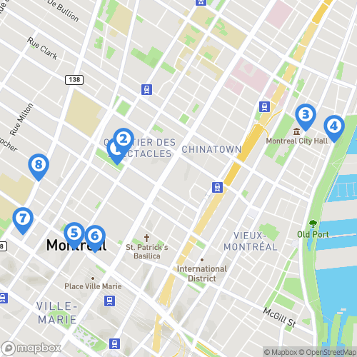 1. Musée d'Art contemporain de Montréal 2. Place des Arts 3. Vieux-Montréal 4. Marché Bonsecours 5. Cathédrale Christ Church 6. Centre-ville de Montréal 7. Musée McCord d'histoire canadienne 8. Rue Sherbrooke Ouest