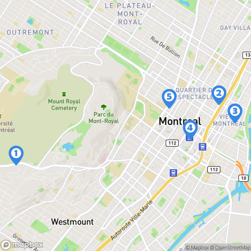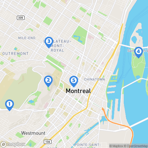 1. Montréal 2. Parc du Mont-Royal 3. Plateau Mont-Royal 4. Île Sainte-Hélène 5. Rue Sherbrooke Ouest