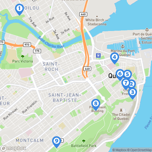 1. Québec 2. Château Frontenac 3. Terrasse Dufferin 4. Rue Saint-Paul 5. Basilique-cathédrale Notre-Dame-de-Québec 6. Hôtel de Ville de Québec 7. Quartier du vieux-Québec 8. Hôtel du Parlement 9. Grande Allée Ouest