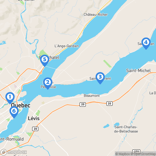 1. Québec 2. Sainte-Pétronille (Île d'Orléans) 3. Saint-Laurent-de-l'Île-d'Orléans 4. Saint-Jean (Île d'Orléans) 5. Parc de la Chute-Montmorency 6. Grande Allée Ouest