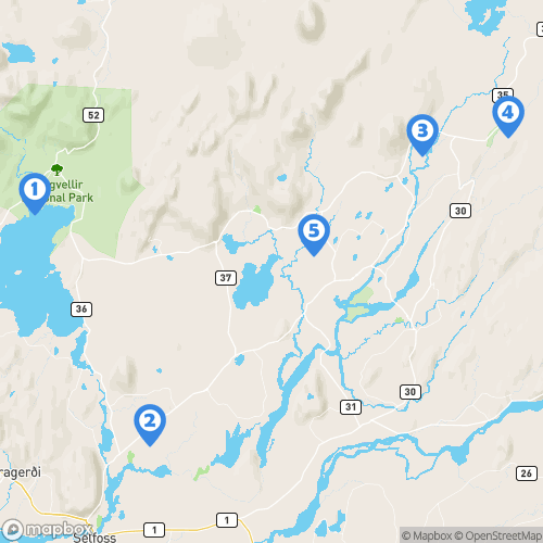1. Parc national de Þingvellir 2. Cratère Kerið 3. Geyser Geysir 4. Cascade Gullfoss 5. Arbakki Farmhouse Lodge