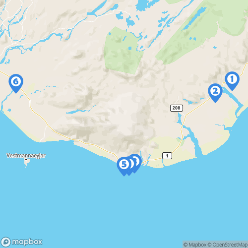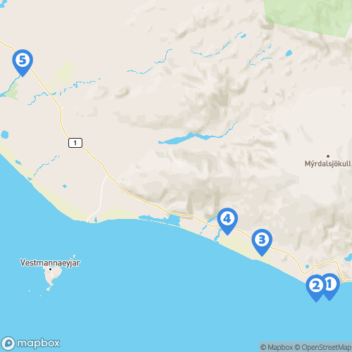 1. Falaises de Dverghamrar 2. Cascade Systrafoss 3. Ville de Vík í Mýrdal 4. Plage de Reynisfjara (Reynisdrangar)  5. Arche de Dyrhólaey 6. Hella